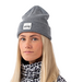 Mid tall beanie with a woven patch in the front made of thick and soft fabric.