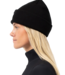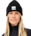 Mid tall black beanie with a woven patch in the front made of thick and soft fabric. The circular knitting results in no side seam for ulitmate comfort.