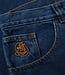 Semi-baggy denim trousers with straight legs and a relaxed fit. Made from 100% cotton denim in a washed Silver Black tone, with a heavyweight 435 gsm structure. Features embroidery on the change pocket, a woven label on the waist, a YKK zipper, and a custom YKK button.