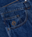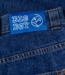 Low-waisted baggy jeans with tapered legs. Made from 100% mid blue cotton denim with a heavyweight 435 gsm feel. Features a YKK zipper, custom YKK button, and embroidered detail on the change pocket. Finished with a woven label on the waist.