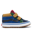 Delivering on a new promise of an all-weather shoe, this heritage silhouette features hook-and-loop closures, enhanced thermoregulation properties, the new HydroGuard Wrap for moisture management, a lightweight single-density UltraCush™ footbed, and our classic all-conditions rubber in a reverse waffle pattern for traction that keeps you covered from city streets to the uncharted outdoors. Finished with durable water repellent-treated suede uppers, the Kid Sk8-Mid Reissue V MTE-1 brings an iconic Vans aesthetic to uncompromising cold weather comfort.